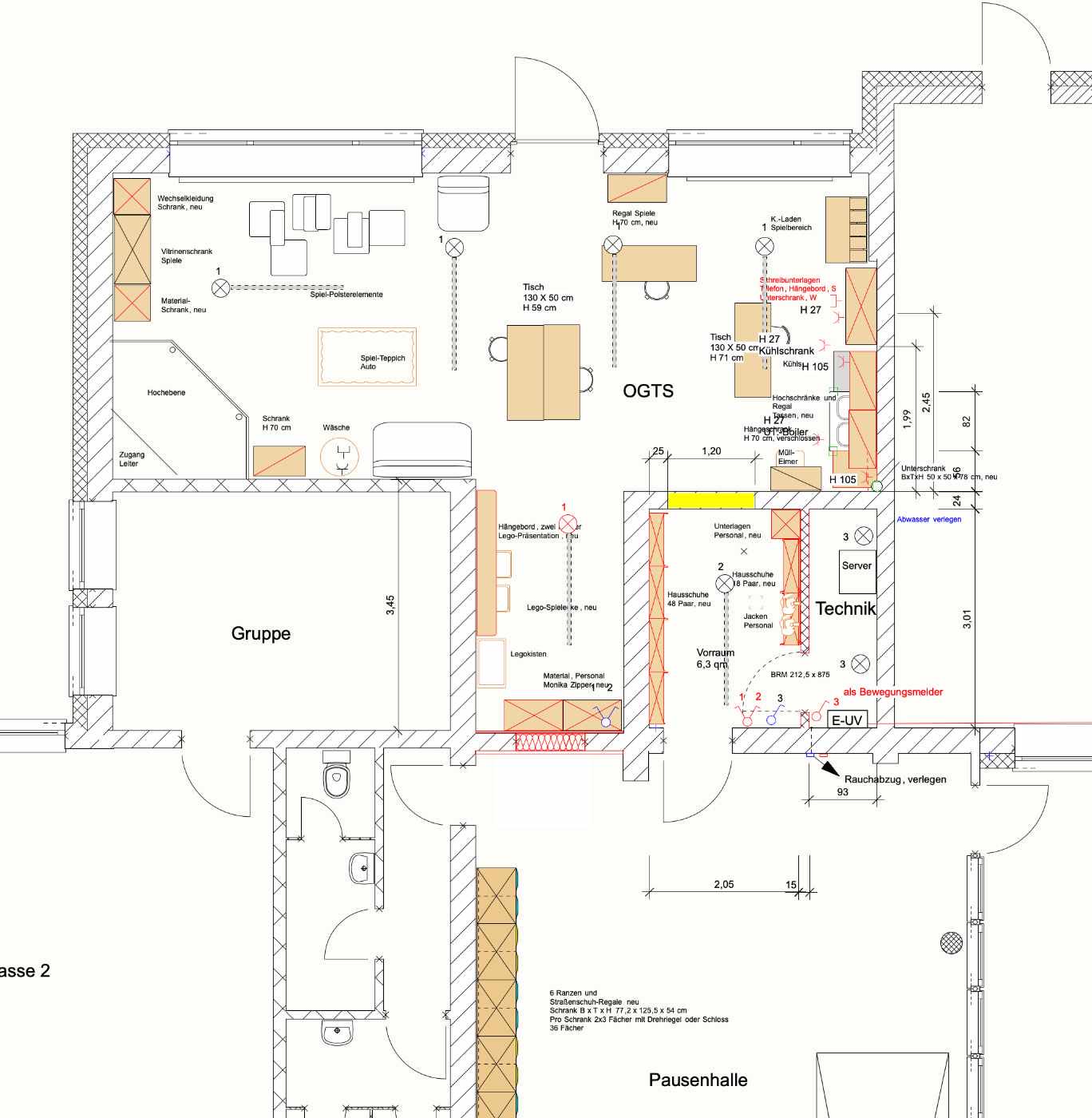 Wie im Bauabschnitt Fassadensanierung, standen auch für die Umbauarbeiten des Bereichs offene Ganztagsschule, OGTS, Fördermittel zur Verfügung. Dafür wurde in Absprache mit der Bauherrin vor Ausführungsbeginn eine Kostenschätzung nach DIN 276 , sowie eine Baubeschreibung für den Förderantrag erstellt.
