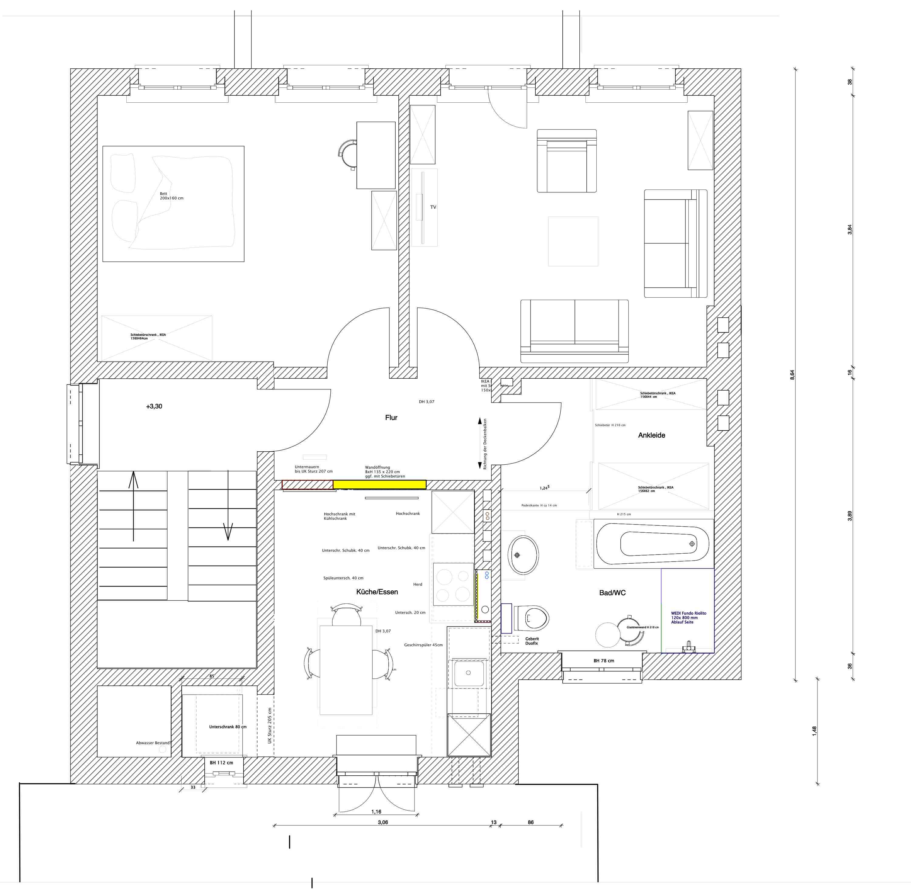 Entwurf, Gestaltung des Wohnraumes im ersten Obergeschoss. Neues Bad, Zugang zur Terasse.
