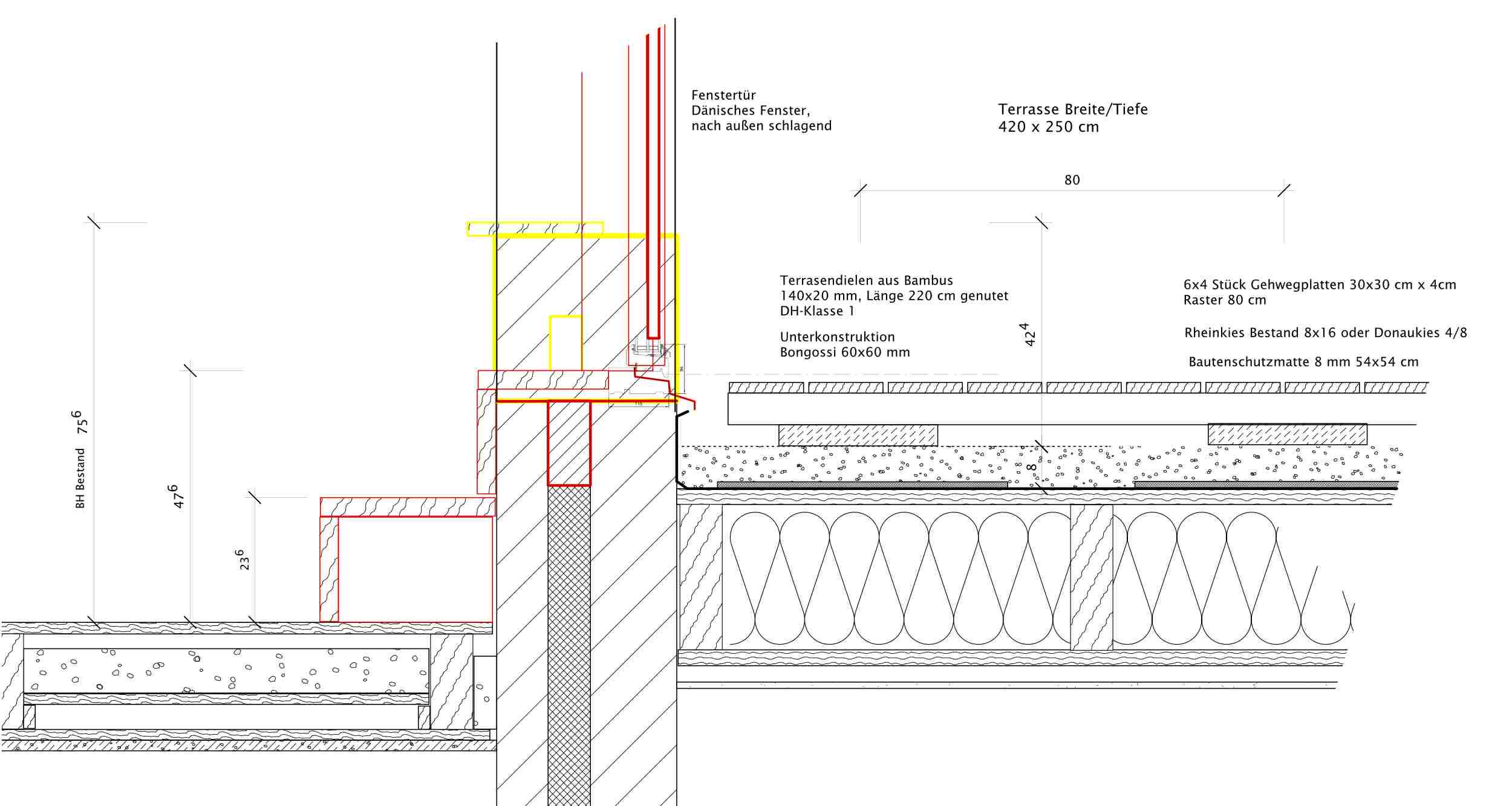Detailplan, Austritt auf die Terasse, Dachfläche Anbau.
